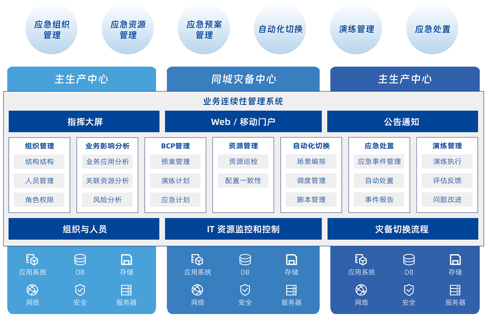 基于業(yè)務(wù)連續(xù)性全生命周期管理的設(shè)計(jì)理念,采用一體化的技術(shù)管理平臺,將風(fēng)險(xiǎn)分析、業(yè)務(wù)影響度分析、預(yù)案開發(fā)和管理、應(yīng)急演練、應(yīng)急響應(yīng)、應(yīng)急恢復(fù)等業(yè)務(wù)連續(xù)性相關(guān)工作全面覆蓋,幫助企業(yè)實(shí)現(xiàn)數(shù)字化的預(yù)案建模、資源實(shí)例化、預(yù)案演練、預(yù)案自動化執(zhí)行、審計(jì)改進(jìn)等各環(huán)節(jié)的閉環(huán)管理。
