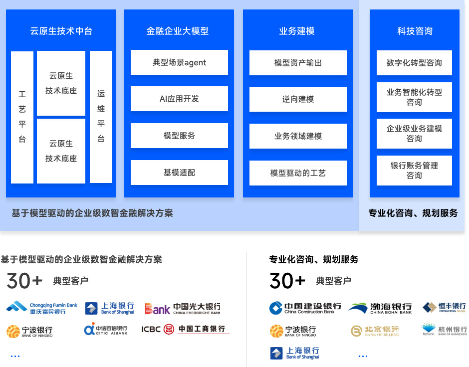 以金融數字化轉型為驅動、以金融科技業務應用為導向、通過提供場景篩選評估、建設和運營的一站式服務,積累了豐富的數據資產沉淀和價值變現經驗
